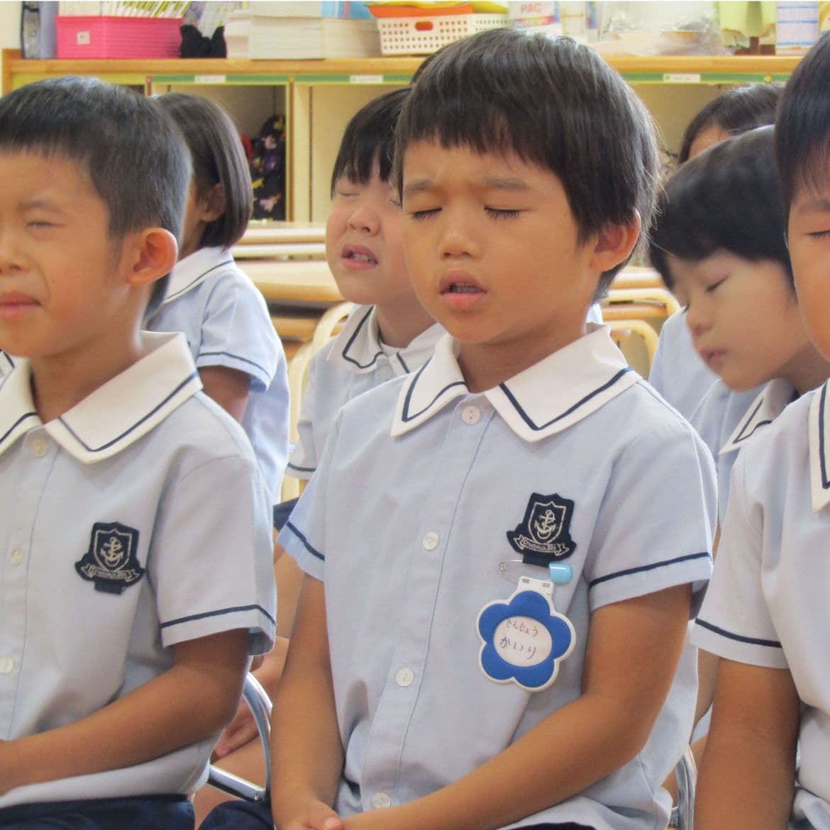 毎朝、聖書のお話を聞いたり、讃美歌を歌ったり、お祈りをする礼拝の時間があります。お話を聞く力、道徳心を育てます。